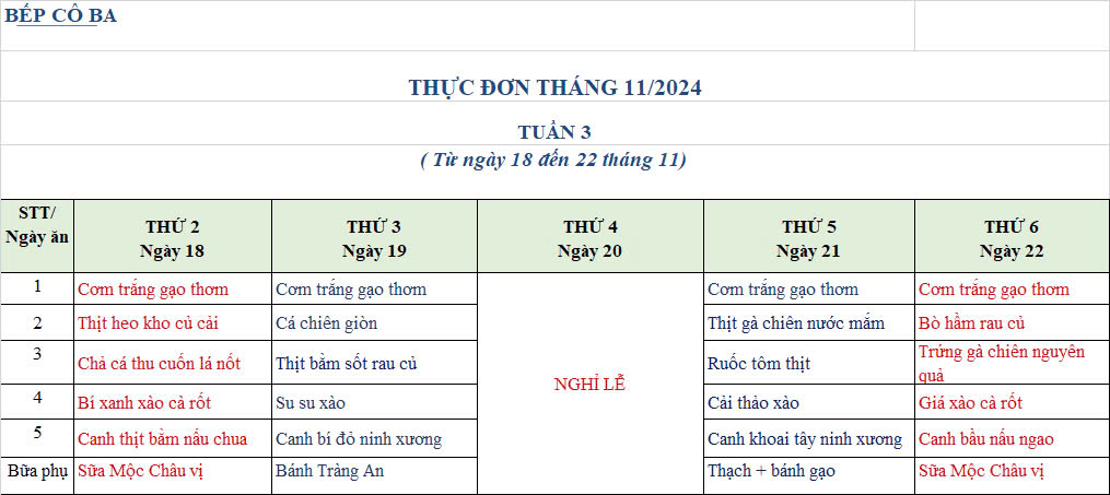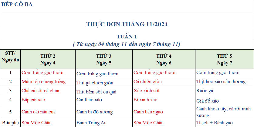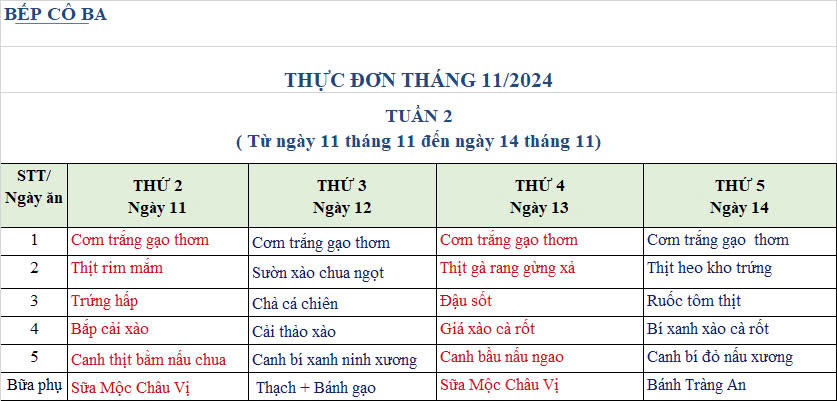 THỰC ĐƠN THÁNG 11.2024