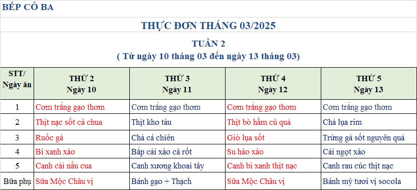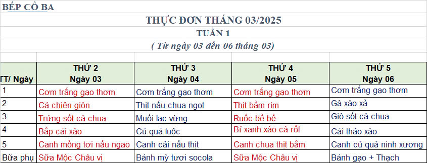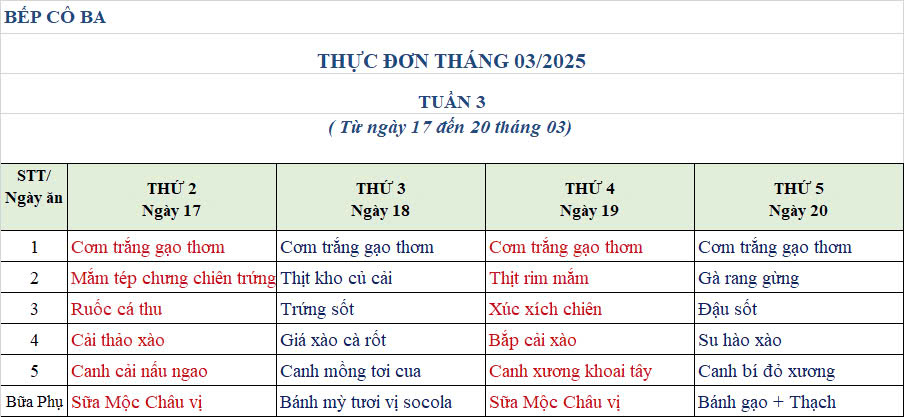 THỰC ĐƠN THÁNG 3.2025