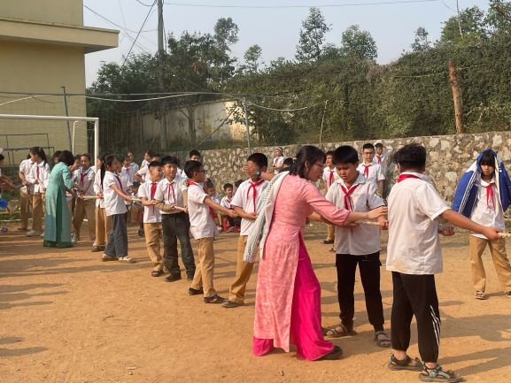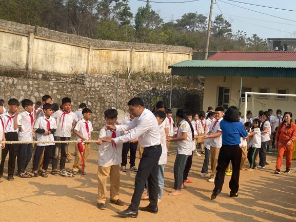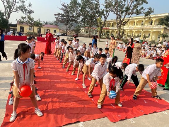 Sau phần lễ trang trọng, các em học sinh tiếp tục tham gia các trò chơi tập thể vui nhộn như kéo co, tiếp sức và bơi thuyền trên cạn. Những tiếng hò reo, cổ vũ vang lên không ngớt, tạo nên một bầu không khí náo nhiệt và hào hứng. Mỗi trò chơi không chỉ mang lại niềm vui mà còn giúp các em học sinh rèn luyện tinh thần đồng đội, sự nhanh nhẹn và khéo léo.