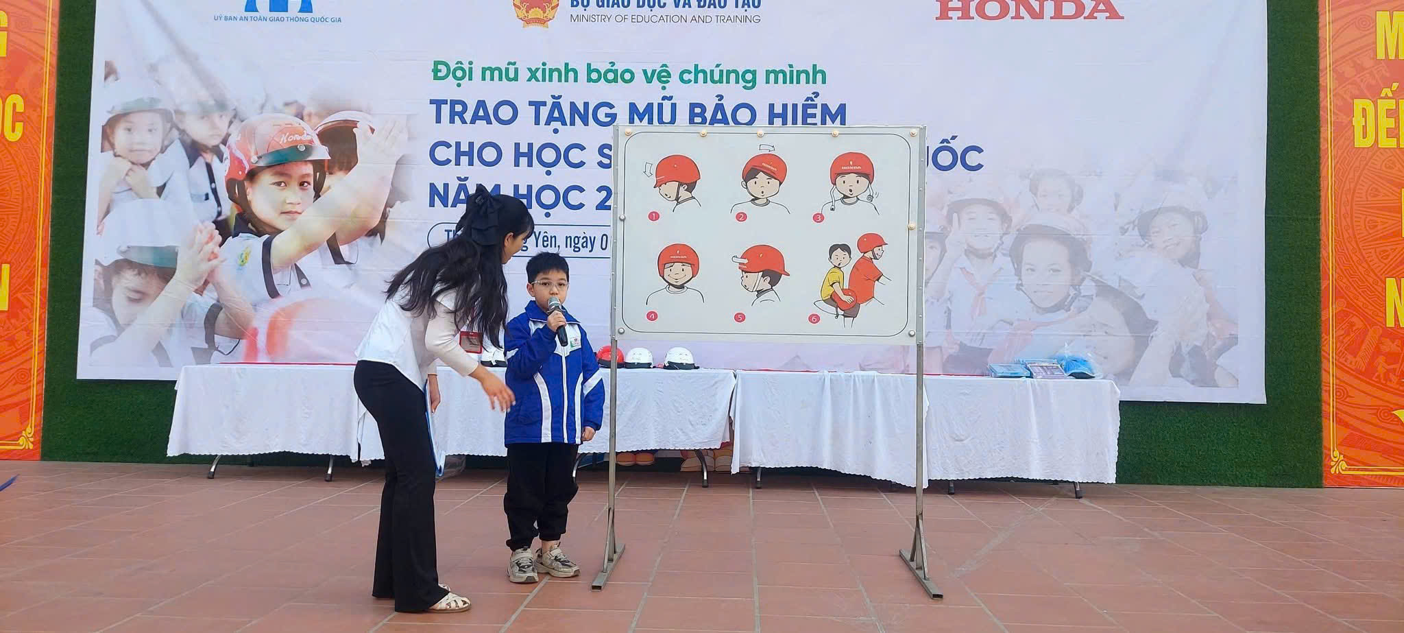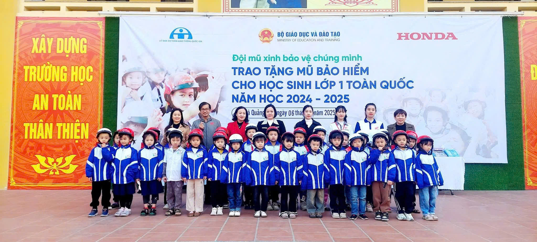 Hình ảnh đại diện các em học sinh lớp một nhận mũ bảo hiểm từ công ty Honda Thủy Lâm