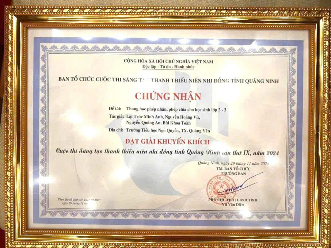 Lại Trúc Minh Anh, Nguyễn Quảng An, Nguyễn Hoàng Vũ, Bùi Khoa Toàn đã xuất sắc đạt giải Khuyến khích tại Cuộc thi Sáng tạo Thanh Thiếu niên Nhi đồng tỉnh Quảng Ninh lần thứ IX, năm 2024 với đề tài đầy ý nghĩa: “Thang học phép nhân, phép chia cho học sinh lớp 2-3”.