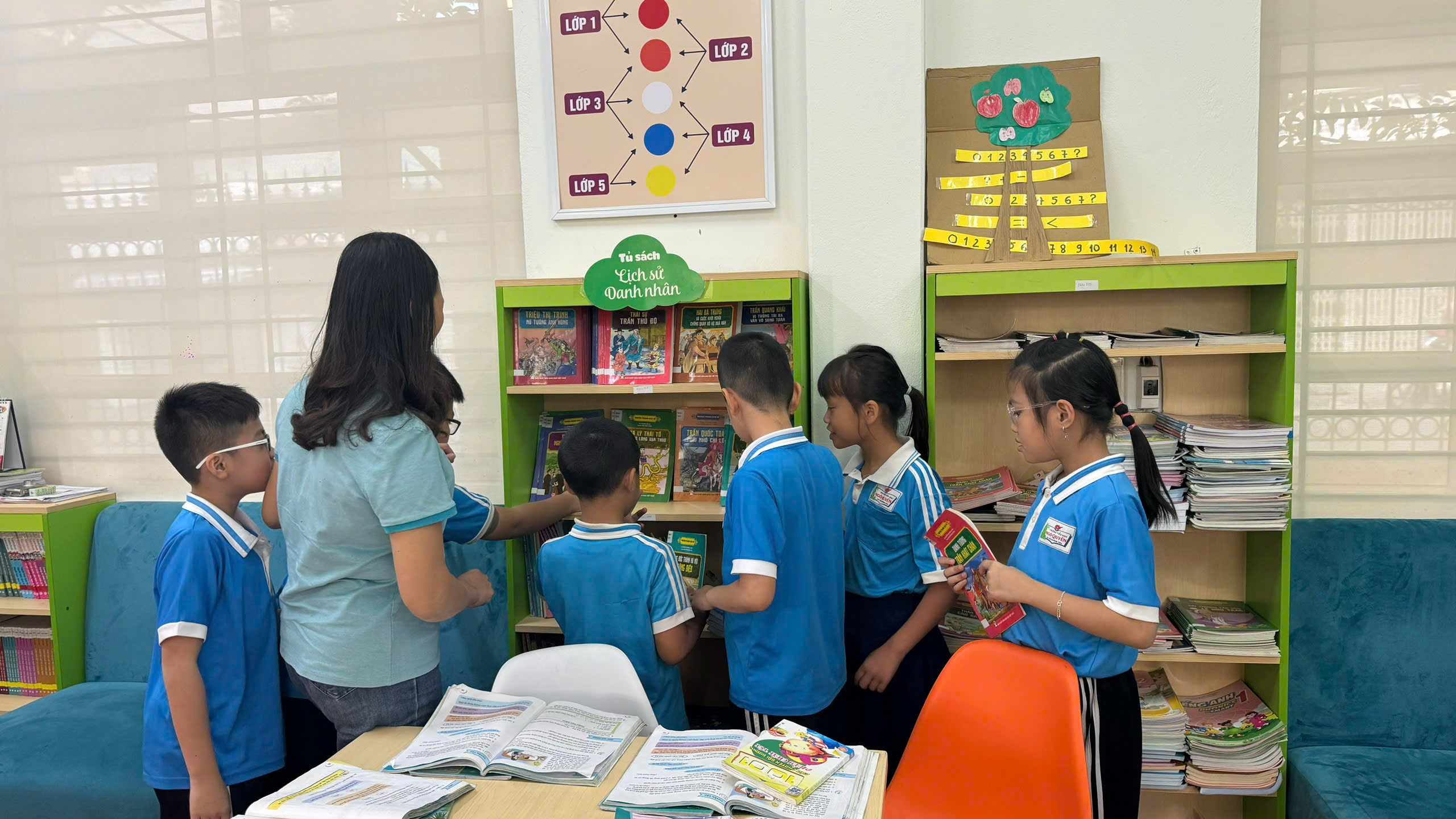 Thay vì chỉ giới hạn ở những kiến thức khô khan trong sách giáo khoa, tiết học thư viện mang đến cơ hội để các em: Làm quen với những tác phẩm văn học kinh điển, truyện cổ tích, truyện ngụ ngôn, và sách tham khảo đa dạng. Tham gia các hoạt động đọc sách, thảo luận, và chia sẻ cảm nhận từ những câu chuyện hay. Học cách phân tích, suy luận, và rút ra những bài học ý nghĩa từ mỗi trang sách.