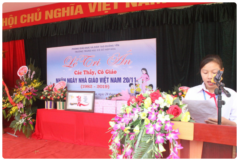 Bên cạnh niềm vui chung của thầy và trò trong cả nước khi tháng 11 về, thầy và trò trường THCS Hiệp Hòa còn có những niềm vui, niềm tự hào riêng khi được học ở một ngôi trường mới khang trang, và đạt được nhiều thành tích đáng ghi nhận. Có được thành công đó là nhờ vào công lao dạy dỗ của rất nhiều thầy cô giáo trong nhà trường. Và để tỏ lòng Tri ân của thế hệ học trò đối với các thầy cô giáo, em Đinh Thị Liên (học sinh lớp 8A) đại diện cho gần 600 bạn học sinh trong nhà trường đã gửi tới các thầy cô những tình cảm sâu sắc qua lời phát biểu tri ân đầy cảm xúc của mình.Qua góc nhìn của cô trò nhỏ, mỗi thầy cô giáo trường THCS Hiệp Hòa đều để lại dấu ấn riêng trong lòng thế hệ học trò. Từ đó, mỗi thầy cô tiếp tục cống hiến, truyền ngọn lửa đam mê,nhiệt huyết yêu nghề, mến trẻ của mình cho lớp học trò sau.