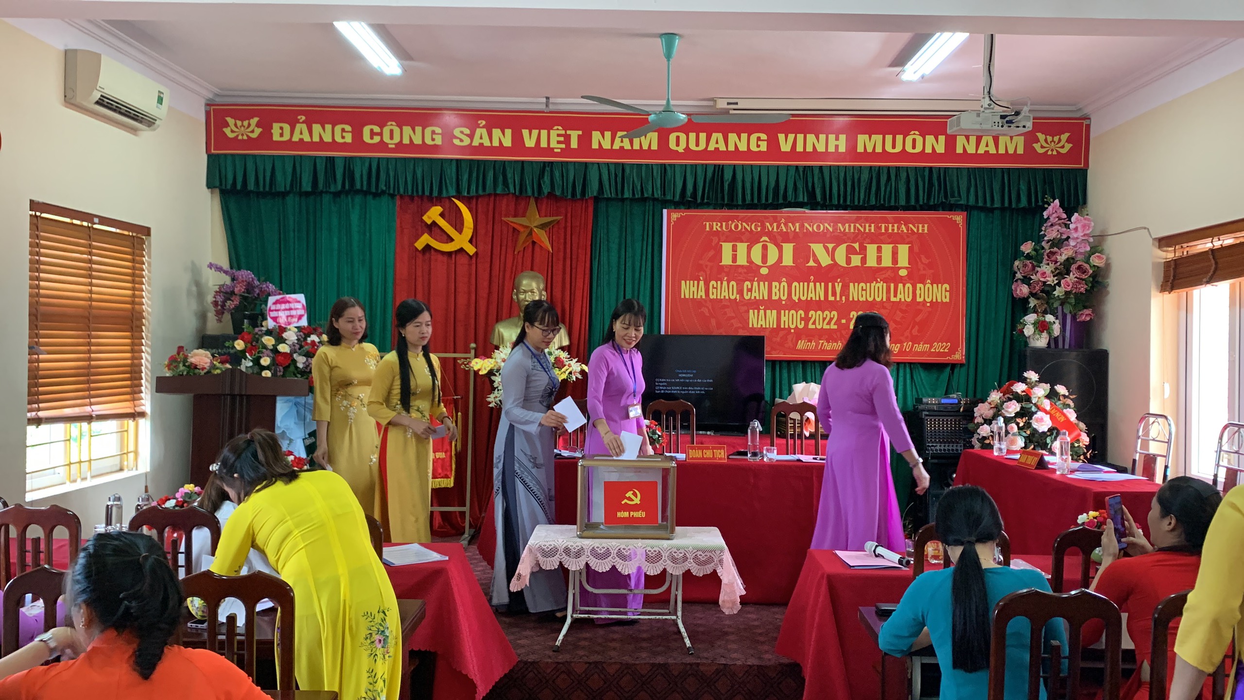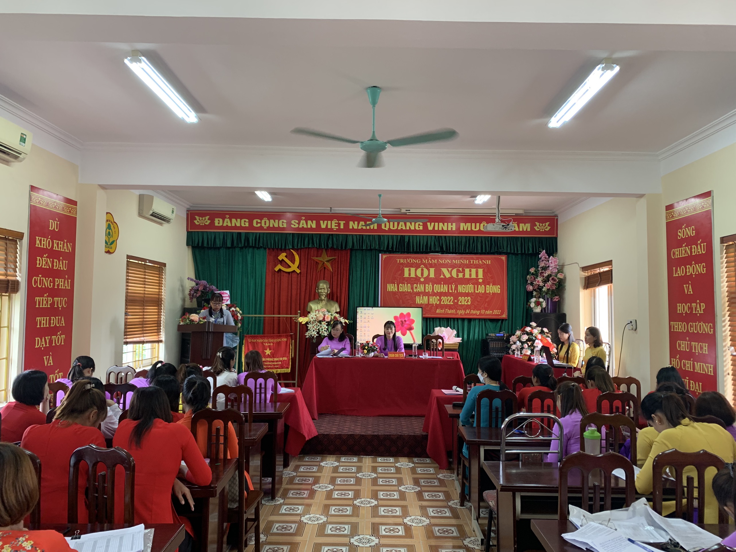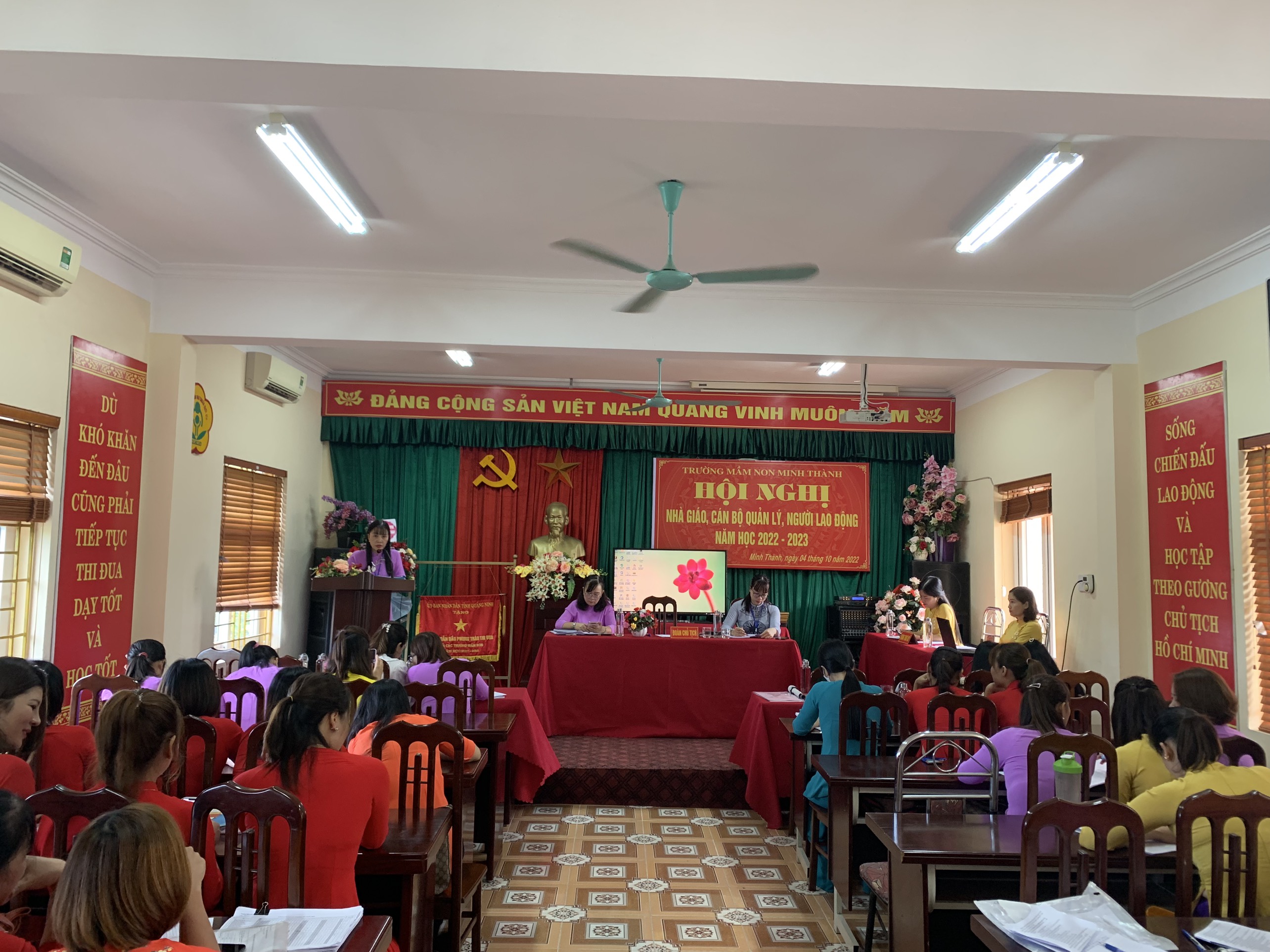 Thực hiện theo kế hoạch, ngày 04 tháng 10 năm 2022. trường mầm non Minh Thành tổ chức "Hội nghị nhà giáo, cán bộ quản lý, người lao động". Hội nghị được nghe báo cáo kết quả thực hiện nghị quyết hội nghị nhà giáo, cán bộ quản lý, người lao động năm học 2021 - 2022, phương hướng thực hiện nhiệm vụ năm học 2022 - 2023.và báo cáo hoạt động của Ban thanh tra nhân dân nhiệm kỳ 2020 - 2022. bầu ban thanh tra nhân dân mới cho nhiệm kỳ 2022 - 2024. thông qua các quy chế và ký giao ước thi đua với nhà trường. Hội nghị diễn ra thành công tốt đẹp.